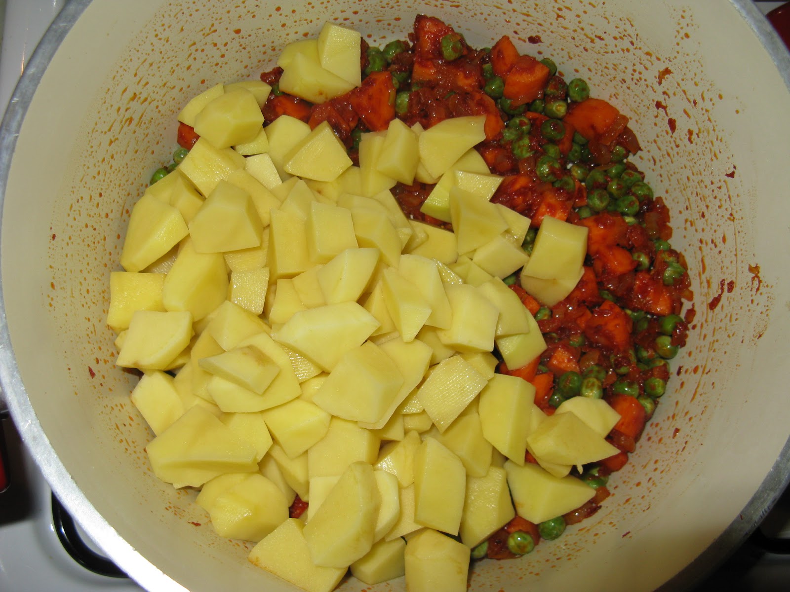 Dilimlenmiş havuç, mantar, biber ve bezelyeyi ekleyip karıştırın.